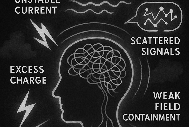 ADHD can be seen as a dysregulation in an individual’s internal electromagnetic field — a chaotic or unstable current flow. Attention flickers like an unstable frequency, and impulses jump erratically like electrical surges. Instead of a smooth, focused signal, the mind experiences noisy, scattered patterns, unable to maintain a steady circuit. Hyperactivity mirrors excess current with insufficient grounding, and distractibility reflects weak field containment, where external “signals” override internal focus.
